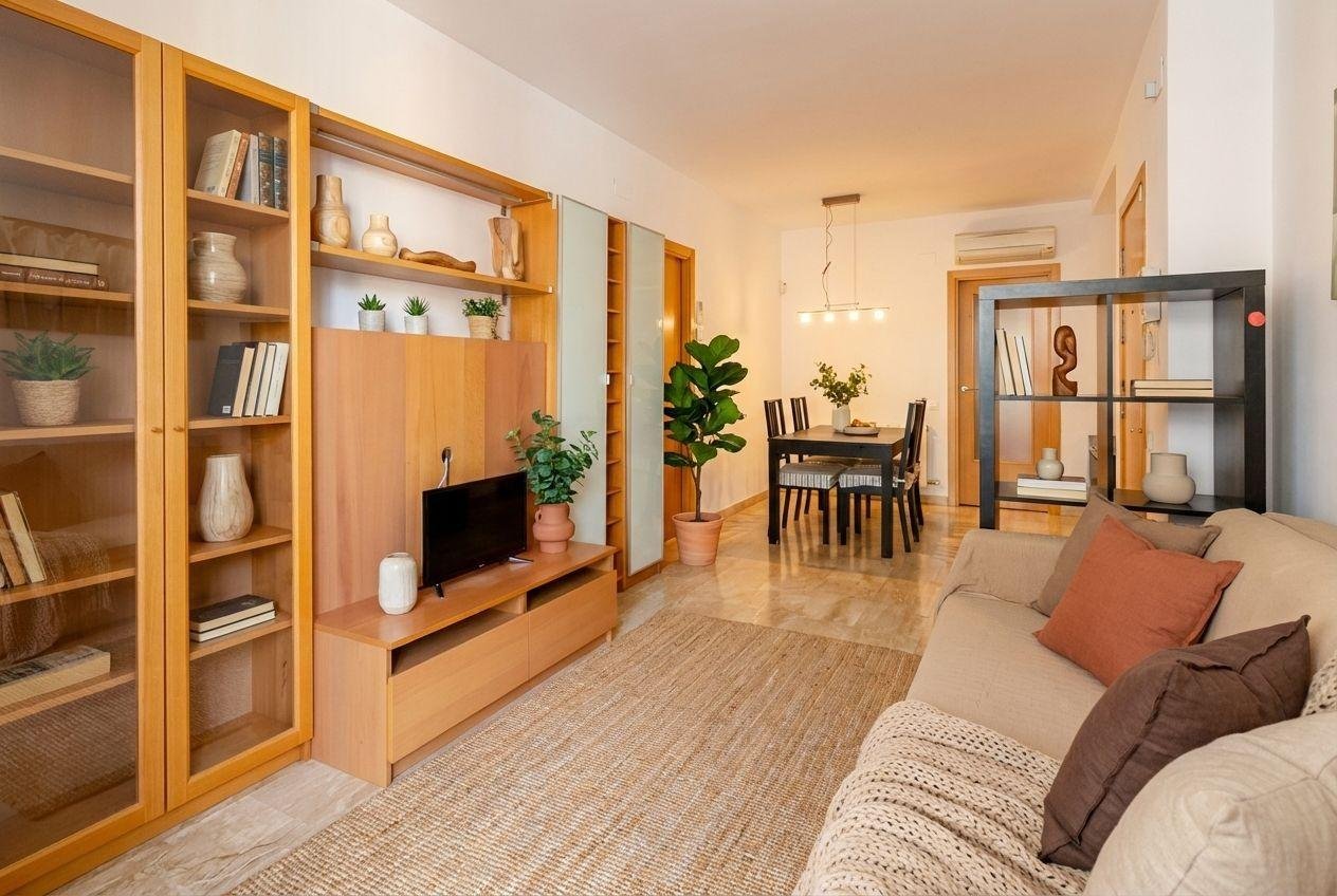 Al acceder, te recibe un amplio salón‑comedor bañado por la luz de la mañana gracias a su elegante puerta balcón de cristal, creando un ambiente cálido y agradable.