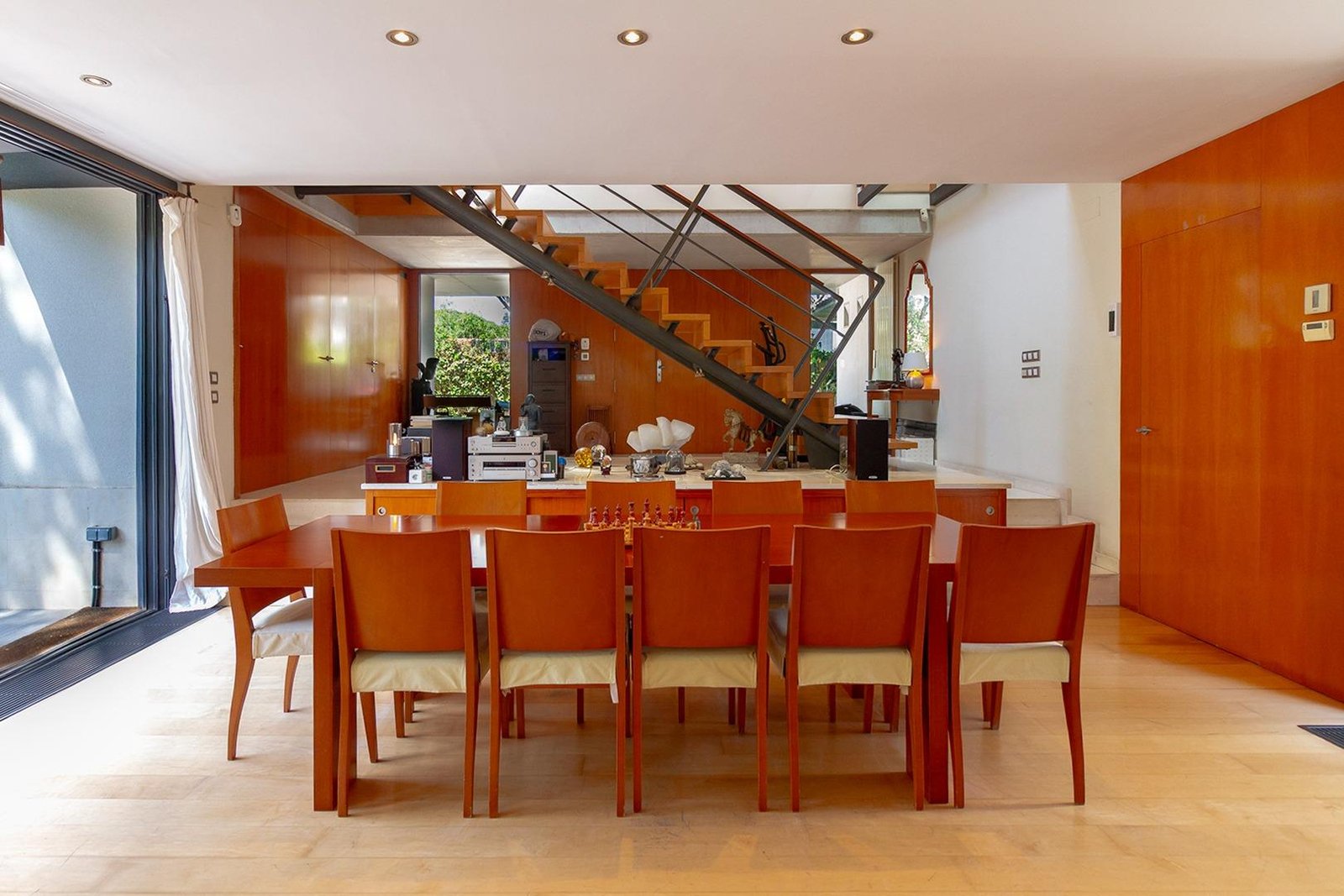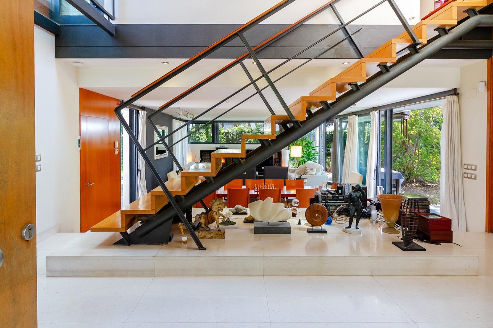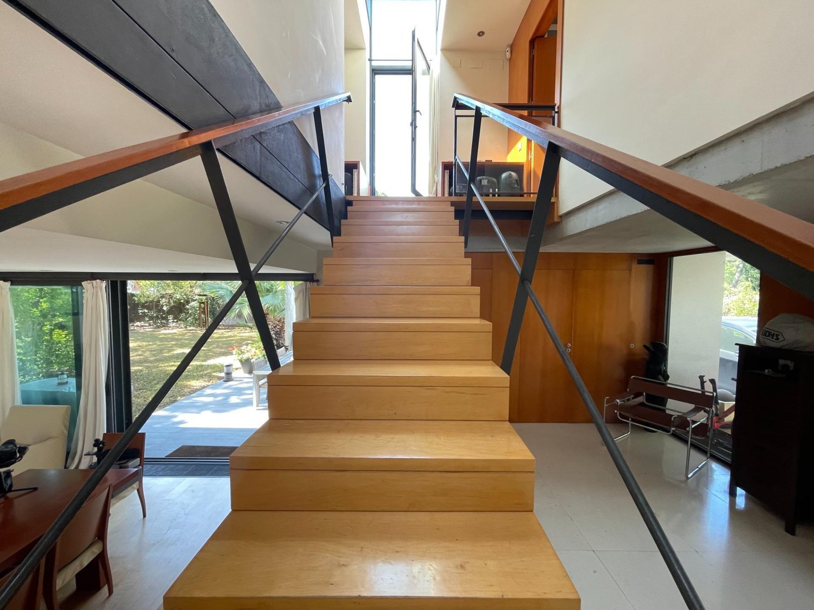 El jardín, un auténtico bosque privado, es un remanso de paz con caminos naturales, zonas verdes y una piscina de 12 x 5 m como protagonista, rodeada de áreas de descanso y solárium. La propiedad incluye parking cubierto para cuatro vehículos y un acceso auxiliar para servicios, combinando practicidad y estética.